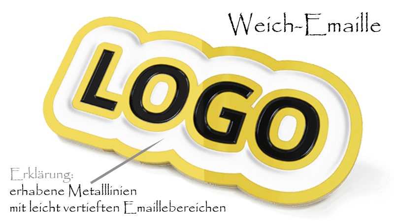 Beim Weich-Emaille-Verfahren wird die Farbe in die leicht vertieften Bereiche innerhalb der vorhandenen Metalllinien gefüllt, wodurch die Oberfläche eine fühlbare Struktur erhält. Die Farben liegen etwas unter dem Metallrand, was der Anstecknadel einen dezenten, reliefartigen Effekt verleiht.