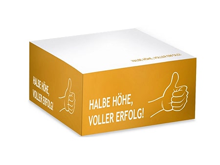 Die Seitenflächen und Blätter des Notizquaders können individuell nach Ihren Vorstellungen gestaltet werden. Platzieren Sie Ihr Logo, Ihren Slogan oder Ihr Corporate Design und machen Sie Ihren Notizblock zu einem unverwechselbaren Markenbotschafter.