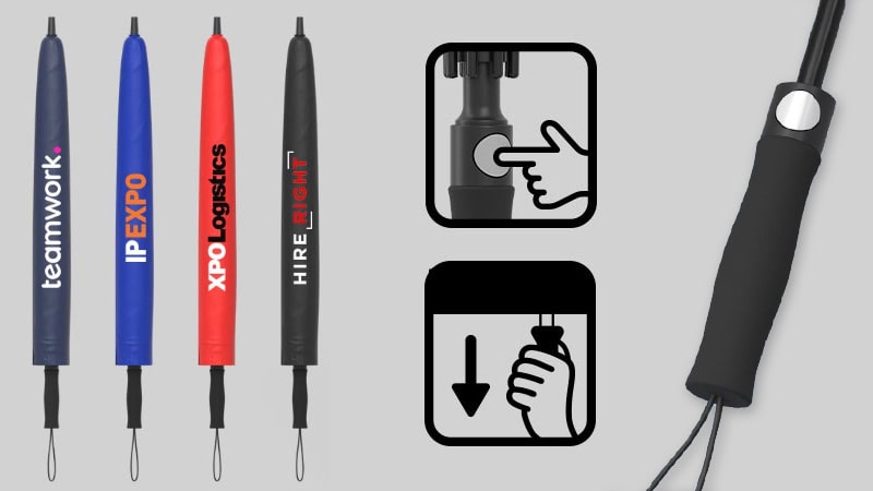 1,2 m Breite im geöffneten Zustand, ergonomischer Griff, praktische Trageschlaufe, Öffnen und Schließen per Knopfdruck