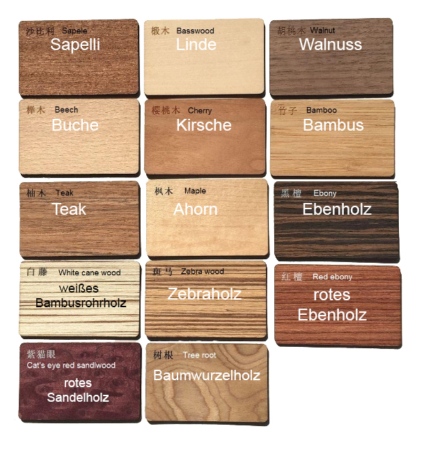 Sie haben die große Auswahl an verschiedenen Holzsorten für Ihre persönliche Holz-Blockerkarte. Z.B. Birke, Buche, Bambus, Kirschholz, dunkles Walnussholz oder Sapelliholz.